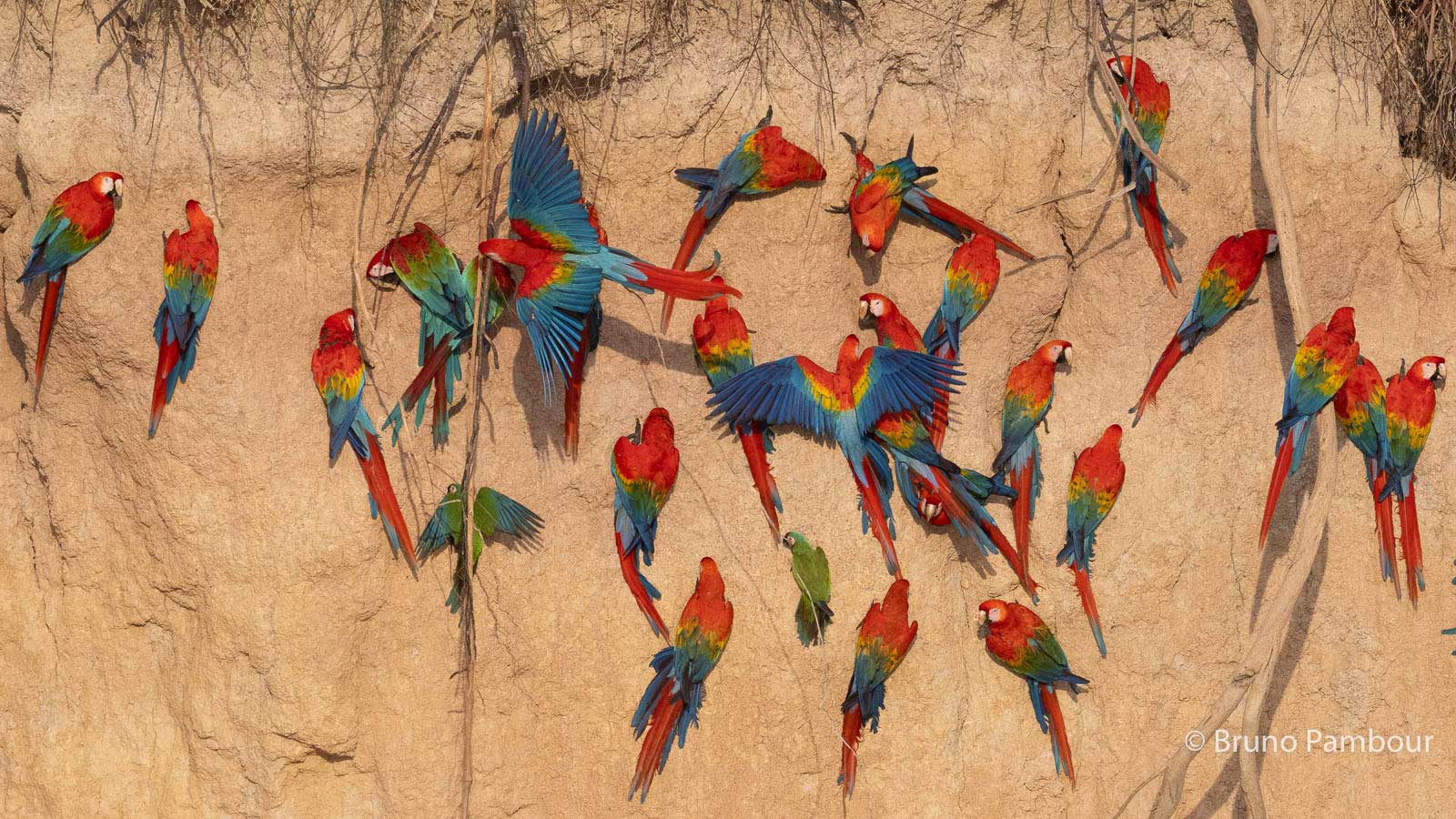 Enfin, le bassin amazonien avec la Réserve de Tambopata et ses célèbres « colpas », berges argileuses où viennent se nourrir 16 espèces de Perroquets dont 5 Aras (rouge, chloroptère, jaune et bleu, vert et macavouanne) à proximité de singes, tapirs, caïman et de centaines d’autres espèces.